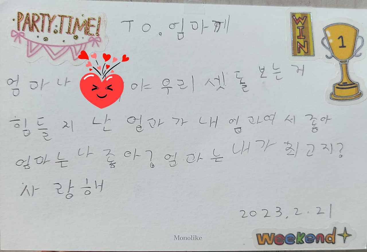 올해 초등학교 3학년이 된 큰 딸은 애정표현을 많이 한다. 생일 땐 잊지 않고 선물과 편지를 준비한다. 준비는 혼자 하더라도 꼭 동생과 함께 나에게 준다. 생일 때 받은 편지는 큰 딸이 옷장에 넣어 둔 그대로 있다. 옷장을 열 때마다 아이의 편지로 힘을 얻는다.