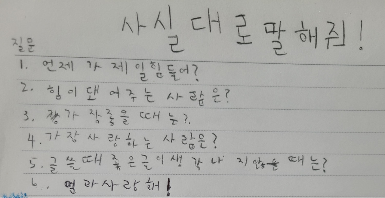 육아와 살림을 하다 보면 쉽게 지나쳐 버리는 일상들이 많다. 그중 하나가 아이의 마음을 알아차려 주는 일이다. 아이가 셋이다 보니 1대 1로 마주 앉아 대화할 수 있는 시간이 거의 없다. 청소를 하고 빨래를 하고 치우고 또 치우는 일이 일상이 되다 보니 때론 에너지가 방전되어 아이의 마음을 알아주는 것이 사치로 느껴지기도 한다. 아무리 힘들어도 아이들의 순간순간을 놓치지 않고, 화도 내고 싶지 않은데 참지 못할 땐 내가 그러려고 한 게 아닌데 하는 억울한 마음이 쑥 올라온다. 엄마도 사람인지라 끝도 없는 육체 및 정신노동에 정신줄을 놓게 될 때도 있다. 그런 순간에 큰 딸이 내게 퀴즈를 냈다. 공책에 적어두었다며 풀어보라 한다.