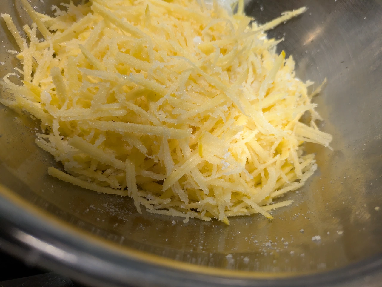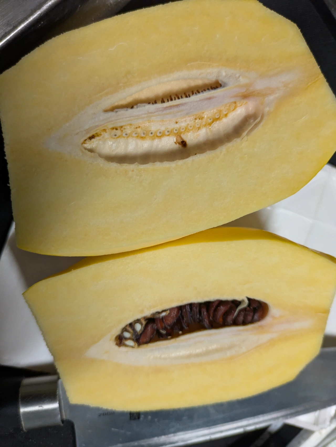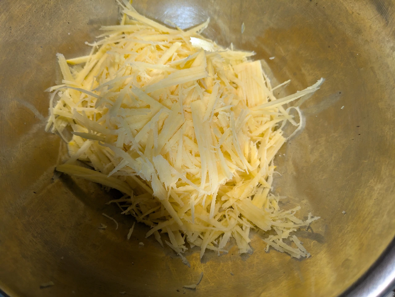 반으로 갈라서 씨앗을 제거한 뒤 감자 채칼로 채 썬다.
