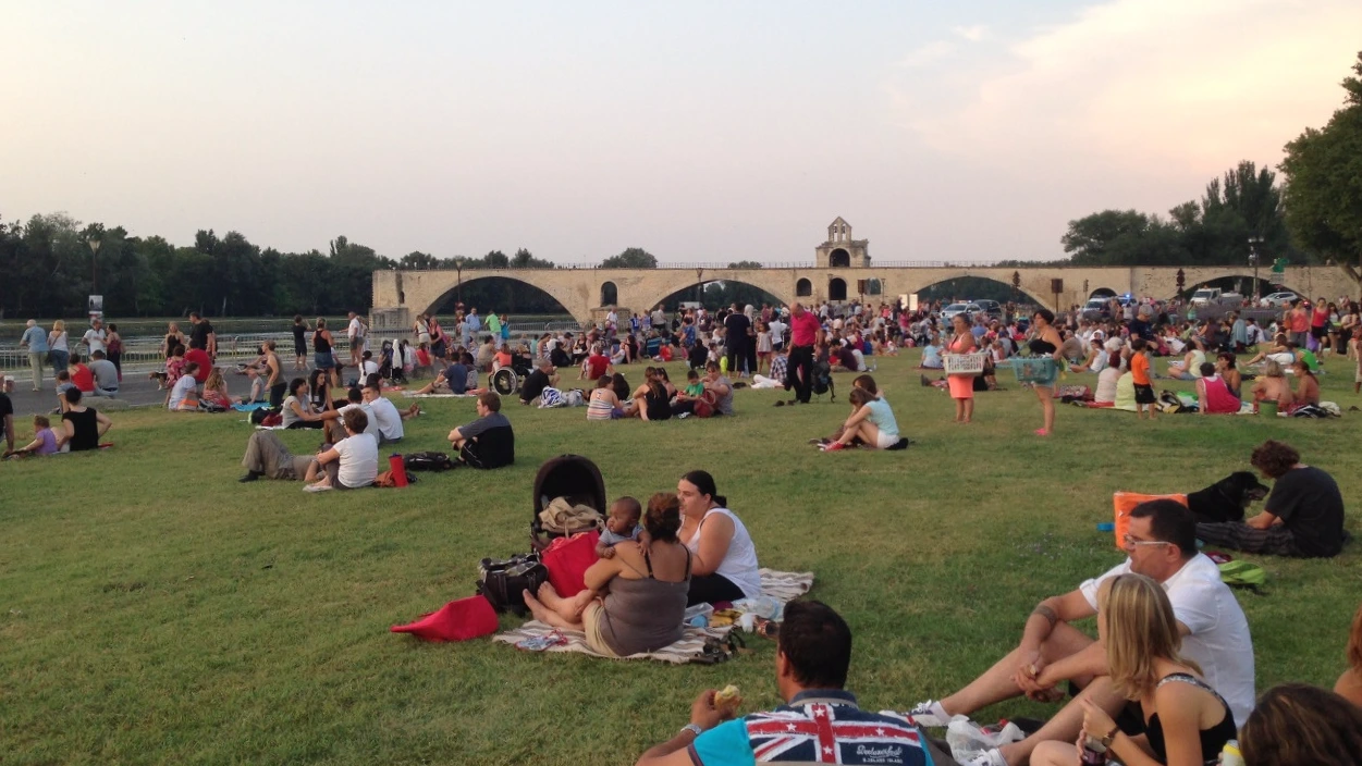 미셸의 친구들과 돗자리를 깔고 누워서 수다를 떨며 불꽃놀이를 기다렸다. 역시 유럽의 해는 늦게 진다. 8시 반 정도부터 기다리기 시작했는데 10시가 넘어서야 완전한 어둠이 몰려왔다. 10시 30분쯤부터 불꽃놀이가 음악과 함께 시작되었는데 부산 불꽃 축제를 여러 번 본 나에게는 규모가 너무 작고 그저 그랬다. ‘이런 걸 보려고 그렇게 기다려야 했다니...’라는 생각이 들 정도였다. 불꽃놀이가 끝나고도 사람들이 너무 많아서 집에 가기가 쉽지 않았다. 아비뇽에서의 마지막 밤인데 마무리가 좀 아쉬웠다.
