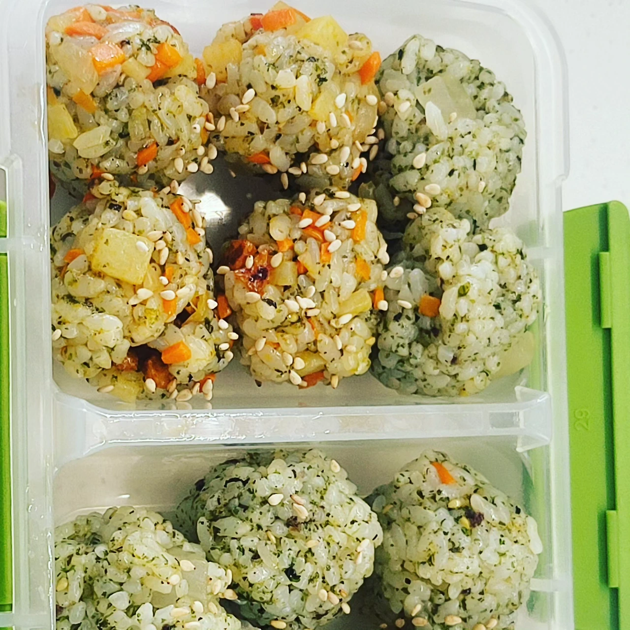 조미양념을 넣고 버무린 밥에 들기름을 들들 두르고 속으로는 매운 어묵볶음과 단무지를 조금씩 넣어 꼭꼭 뭉쳐서 만들었어요.