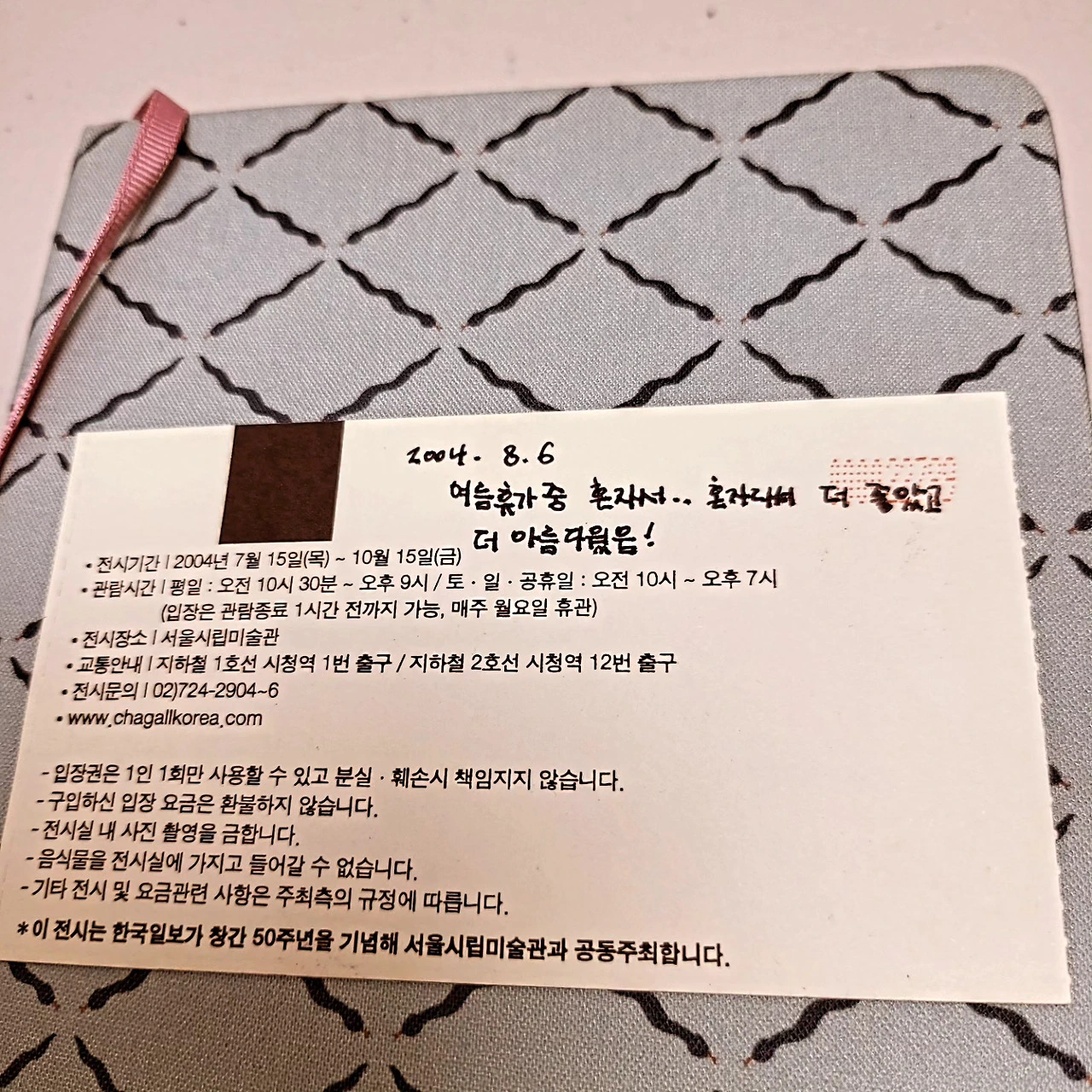 올해 예술의 전당에서 열렸던 '마르크 샤갈' 특별전을 가겠노라 가겠노라 입으로만 읊어대다가 결국은 가지 못했다. 그러다 우연히 예전 다이어리를 정리하다가 내가 2004년도에 다녀온 샤갈 전시회 티켓을 발견했다.
