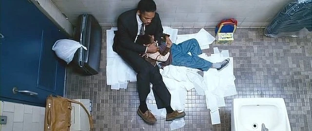 영화 <행복을 찾아서 The Pursuit of Happyness>. 잘 곳이 없어 지하철 화장실에서 잠을 청하는 윌 스미스와 아들