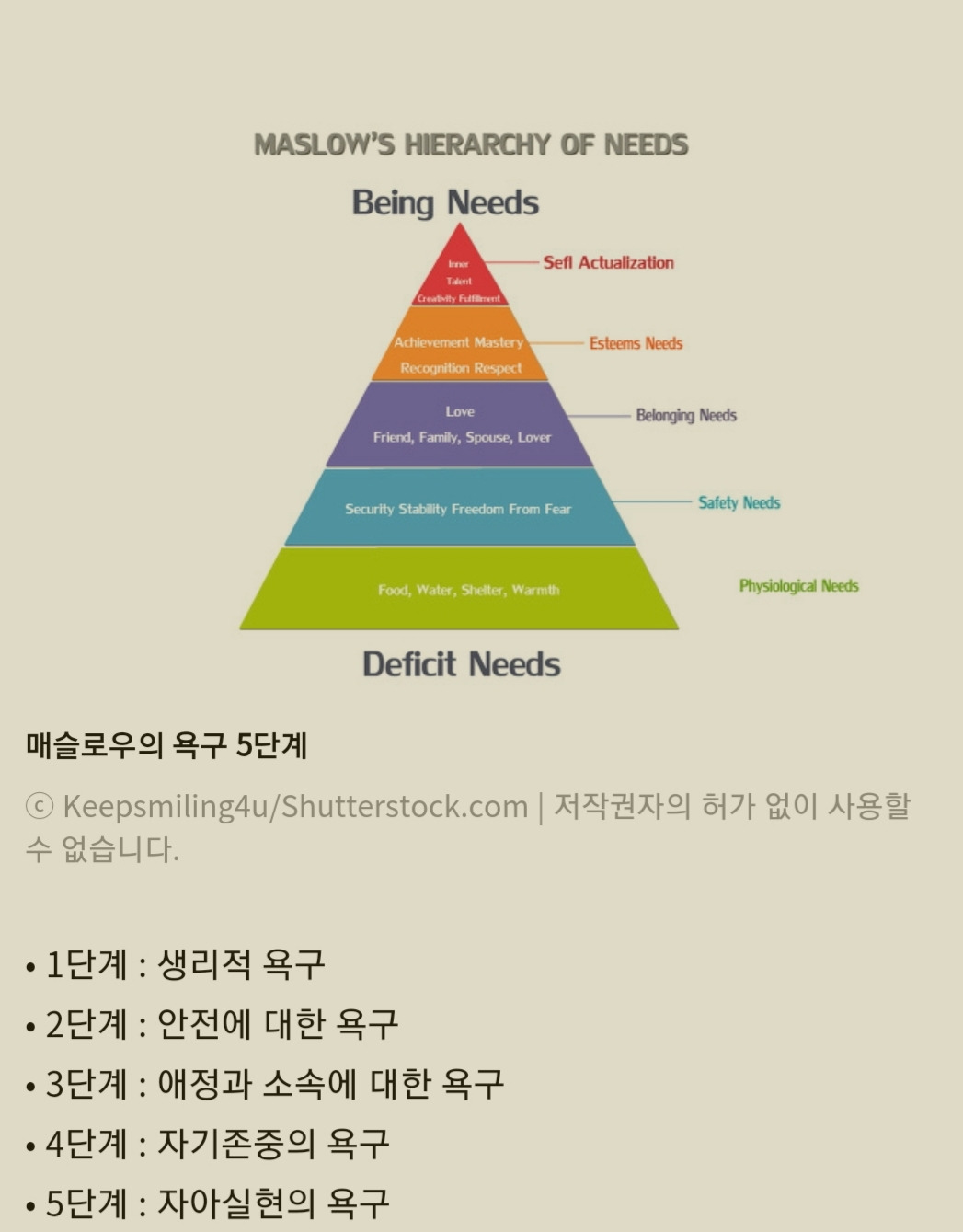 매슬로우 욕구 단계 이론에 의하면 인간은 기본 욕구가 충족될 때, 더 높은 수준의 욕구를 발달시키기 시작하며 이 욕구는 5단계로 분류한다.