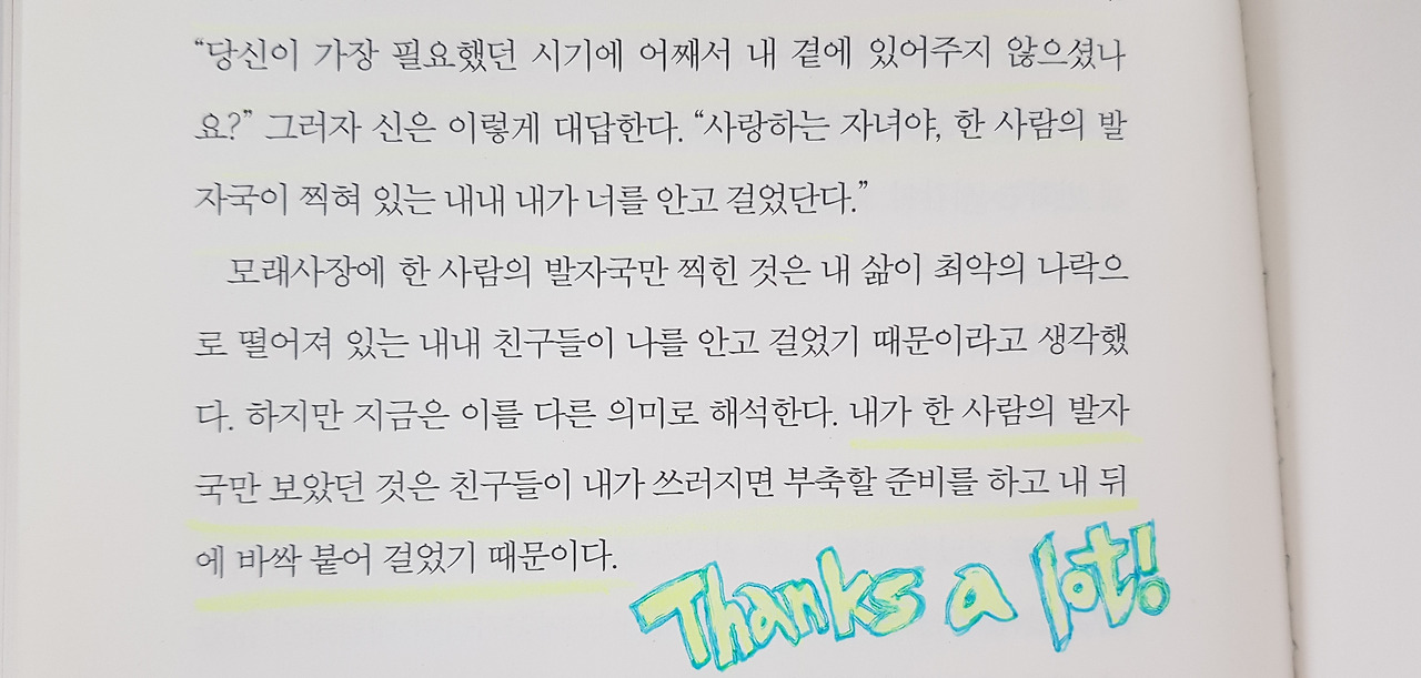 모래사장에 한 사람의 발자국만 찍힌 것은 내 삶이 최악의 나락으로 떨어져 있는 내내 친구들이 나를 안고 걸었기 때문이라고 생각했다. 하지만 지금은 다른 의미로 해석한다. 내가 한 사람의 발자국만 보았던 것은 친구들이 내가 쓰러지면 부축할 준비를 하고 내 뒤에 바싹 붙어 걸었기 때문이다. - p.80