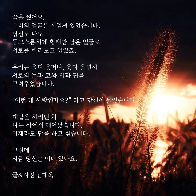 꿈을 꿨어요.우리의 얼굴은 지워져 있었습니다.당신도 나도 둥그스름하게 형태만 남은 얼굴로서로를 바라보고 있었죠.우리는 울다 웃거나, 웃다 울면서서로의 눈과 코와 입과 귀를그려주었습니다.“이런 게 사랑인가요?” 라고 당신이 물었습니다.대답을 하려던 차, 나는 잠에서 깨어났습니다.이제라도 답을 하고 싶습니다.그런데지금 당신은 어디 있나요.