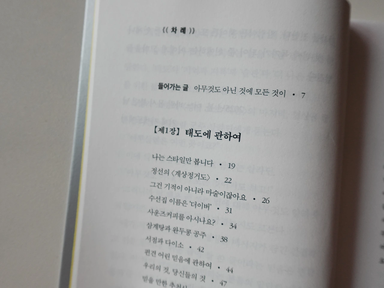 사실 하고 싶은 말은 따로 있다. 『글쓰기의 태도』 가 한동안 기억에 남을 책이 될 거라는 말이다. 작가들이 하는 실수 중 하나가 자기가 쓰는 내용과는 다른 태도를 보일 때다. 말하자면 작가가 말하고자 하는 것과 작가의 행동이 다른 경우다. 그 다름을 책의 내용으로 보여줄 때가 있는데 읽으면서 뭐지? 싶다. 그런 일이 생각보다 자주 있기 배문에 작가 스스로 경계할 필요가 있다. 나 또한 비슷한 경우가 있었다. 나중에 사실을 자각하고 혼비백산하고는 책의 내용을 바꾼 경험도 있다. 책을 그럴듯한 내용으로 채워야 한다는 강박이 만들어낸 상황이다.