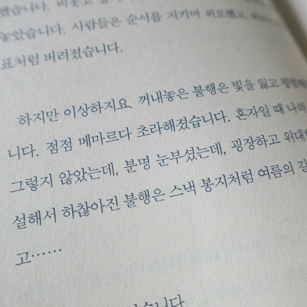 문장 사이의 여백이 적지 않다. 비워둔 공간에는 말하지 않은 것들의 울림이 가득 차 있다. 슬픔 속의 작은 희망, 기쁨 속의 숨겨진 아픔을 문장 안에 가둔다. 작가의 이야기는 개인적이면서도 동시에 보편적이다. 그래서 누군가의 가장 사적인 감정을 투명한 창을 통해 보는 기분이다. 그 감정은 빠르게 나의 경험과 연결된다. 뚜벅뚜벅 문장 속으로 들어가게 만든다. 그러면 이야기와 거리가 점점 가까워진다. 당연하게 내 이야기를 읽는 것처럼 와닿는다.