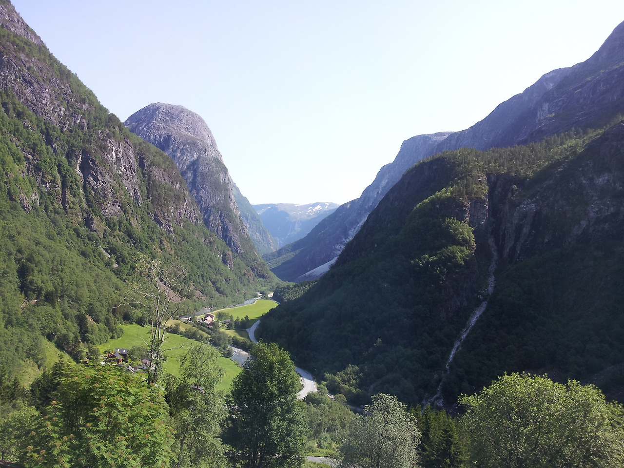7월의 노르웨이, 눈 덮인 산과 푸르른 산.
