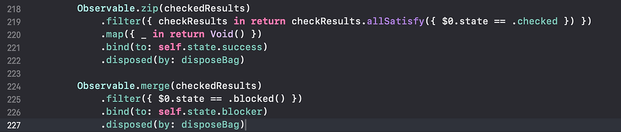 성공을 체크하는 로직은 기존대로 zip operator를 사용하는 반면, 실패 체크하는 로직은 RxSwift의 merge operator을 사용해 체크항목이 통과가 실패한 경우 바로 에러 핸들링되도록 조치해 주었습니다.