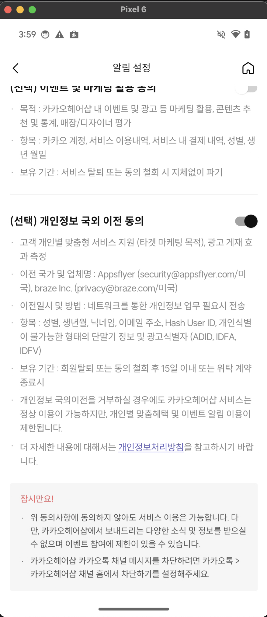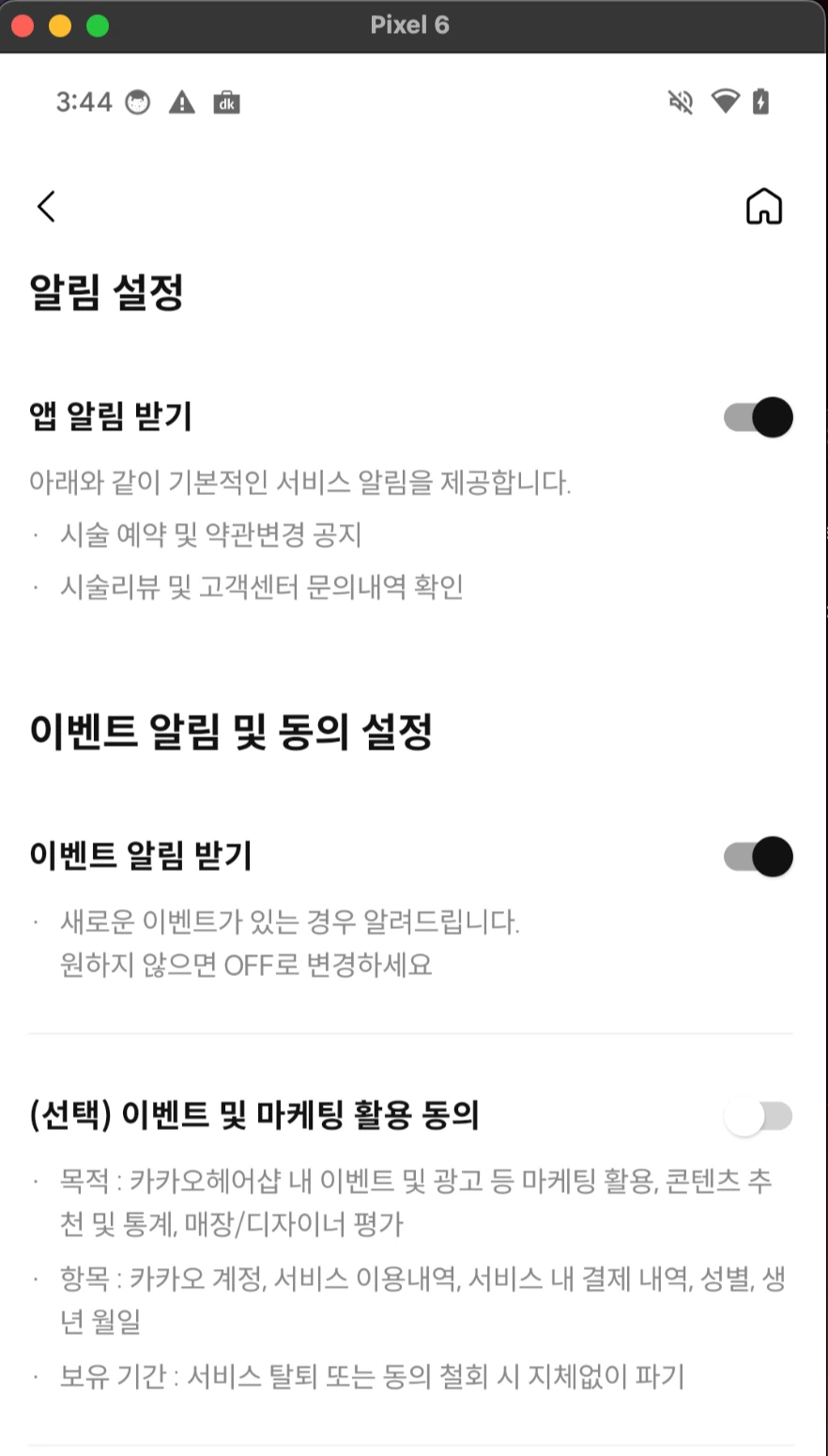 카카오헤어샵 내의 알림설정 화면을 살펴보면 같은 Ui들이 반복되는 것 처럼 보이지만 세세한 부분에서 차이점이 존재합니다.