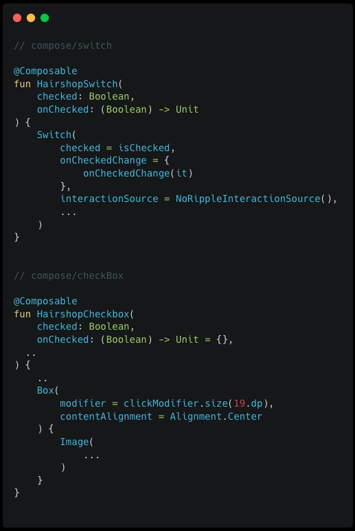 다만, Switch와 CheckBox의 경우 컴포넌트는 동일하며 기능에 맞게 클릭 & 현재 상태에 대해서만 들고 있습니다.