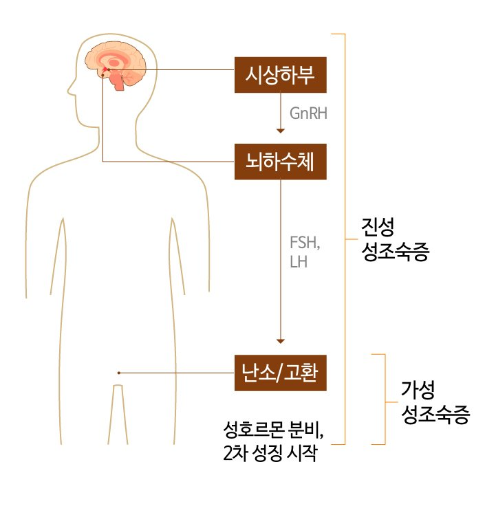 성조숙증은 진성(true)과 가성(pseudo)으로 구분되는데, 진성 성조숙증의 경우 뇌하수체에서 생식샘자극호르몬인 FSH와 LH이 조기에 분비가 증가되어 생기는 질환이다.
