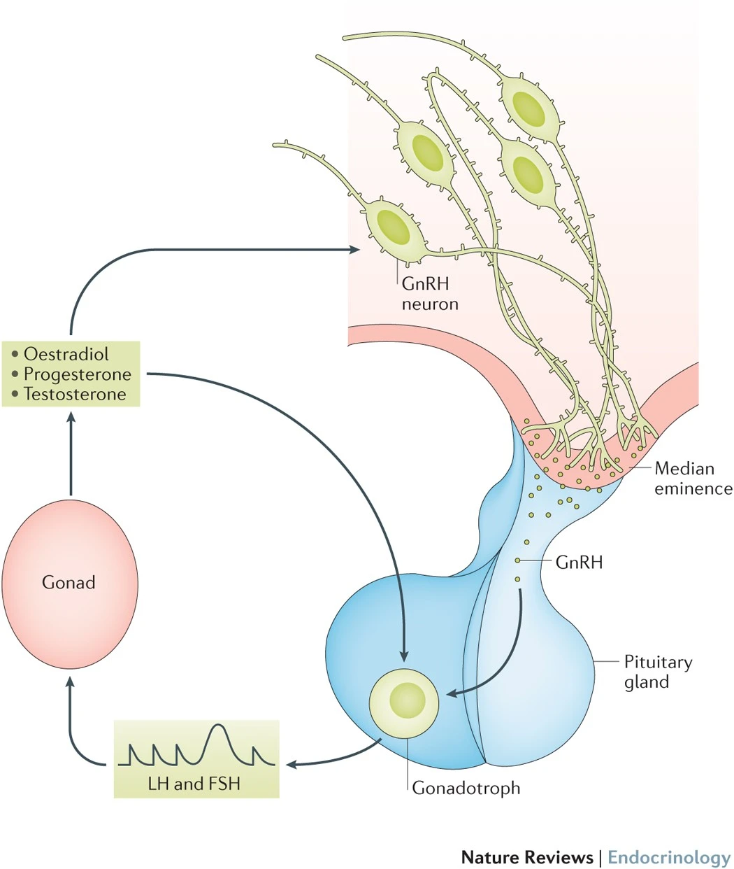 시상하부에서 생식샘자극호르몬분비호르몬(GnRH)이 분비되면 뇌하수체에서 난포자극호르몬(FSH)과 황체형성호르몬(LH) 생산을 촉진한다.