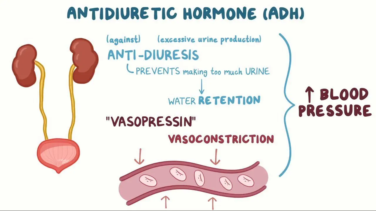 바소프레신은 옥시토신과 마찬가지로 뇌하수체의 뒤쪽 후엽에서 분비된다. 혈액 속의 전해질이 증가하거나 수분이 부족하면 삼투압이 증가하는데, 이렇게 증가된 삼투압을 뇌하수체 후엽에서 인지하면 바소프레신을 분비하여 소변으로 빠져나가는 수분을 감소시켜 혈액의 삼투압을 낮춰준다. 이렇게 이뇨작용이 줄어들면 결과적으로 혈액량이 증가하고 결국 혈압도 증가하게 된다. 따라서 바소프레신은 혈압이 떨어진 환자에서 혈압을 올리는데도 사용된다.
