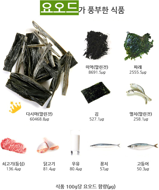 (음식물 안의 요오드 양을 살펴보면 다시마 100g의 경우 무려 17만 9060ug으로 일일 상한치의 100배를 초과하며 김 100g은 3570ug, 미역 100g은 8730ug의 과량의 요오드를 포함하고 있다. 일일 적정 섭취량은 다시마의 경우 3x5cm 1장, 김은 2장 정도이다.)