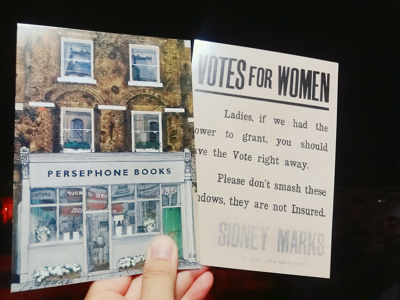 창 밖으로 내리는 비와 관광객들, 블랙 캡을 한참 구경하다가 이 근처에 위치한 페르세포네 북스 서점에 가보기로 했다. 절판되어 사라질 뻔한 여성작가들의 책을 다시 리커버하여 서점 이름과 동명의 자체출판사로 출판하기도 하는 것이 주된 프로젝트다. 자체 출판한 책 외에도 다양한 책을 판매하는데, 여성작가들의 서적만을 취급하고 있다는 것이 이 서점의 아이덴티티다. 여행 초반이라 책의 무게가 부담이 되어 살 수는 없었지만, 엽서를 두장 집어왔다. 서점 자체는 아주 자그마하다. 얉은 음악소리, 걸을 때마다 마룻바닥에서 끼익거리는 소리가 들리고, 계산대 근처에는 배달된 책이 아무렇게나 쌓여있는데 그 모양새가 꽤 운치있었다. 영화 캐릭터로나 나올 것같은 책벌레들의 공간에 들어간 기분. 작은 공간에서 열렬히 일하는 두 직원은 고요한 서점 안을 활기찬 분위기가 돌게끔 만들었다. 난 그 곳에서 버지니아 울프의 <런던을 걷는게 좋아> 원서를 사고 싶었다. 2주동안 있으면서 읽어보려고. 그런데 안타깝지만 그 책은 없었다. 그래도 덕분에 본래 제목이 <Street Hunting>이었던 걸 알게 되었다.(친절하게 종이에다가 써주기까지!) 내 전공을 설명드리자 두터운 카탈로그도 챙겨주며 읽어보라고 해주었다.