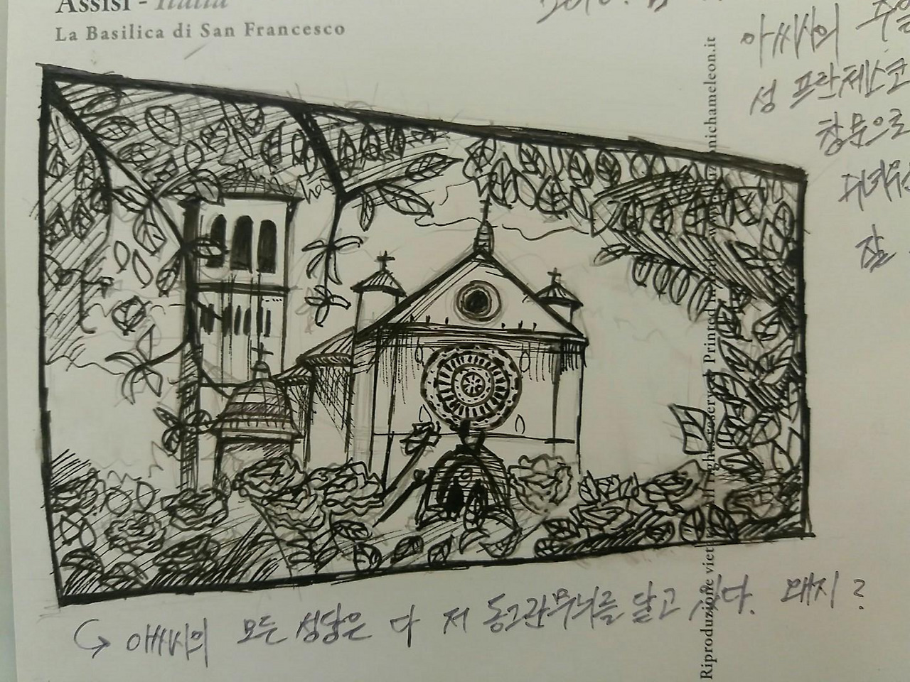 숙소에 돌아가서 잠들기 전까지 언니의 재밌는 일화를 들으며 시간을 보냈다. 피렌체가 너무 좋아서 일정을 하루 더 늘리느라 이 숙소에 체크인조차 못할 뻔했다는 얘기, 밀라노에서 아끼는 필름카메라를 잃어버리고 기차에서 울고 있을 때 뒤에 앉아있던 할아버지가 꽃을 그려주면서 울지 말라고 했다는 얘기(완전 에세이에서나 보던 여행이야기! 그림도 너무 사랑스러웠다.), 한 번 심하게 아파 본 뒤 하고 싶은 건 하고 살아야겠다는 생각을 하게 되었다는 얘기 등.밝고 에너지가 좋은 언니여서 남은 여행도 지나온 여행만큼이나 재미나게 하실 것같다고 생각하며 잠들었다. 그토록 고대했던 피렌체가 기대되면서도, 내가 생각하던 소박하면서도 아름다운 배낭여행의 모든 것을 갖춘 아씨시를 떠나기가 아쉬웠다. 다음날 아침일찍 아무도 없는 성당 앞을 지나쳐 버스정류장으로 가는 길에서도.