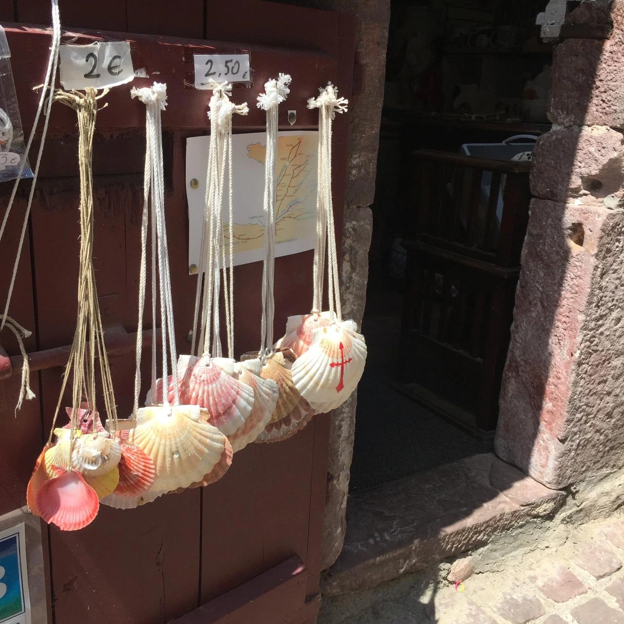생장은 번화한 관광 도시였다. 일반 관광객도 많은 것 같고, 순례자들도 많고.. 슬슬 조개껍데기들이 보이기 시작한다. 순례자의 상징인 조개껍데기.. 사무실에서 2유로에 여권을 발급을 받고. 조개껍데기 하나를 기부금으로 내고 하나 받았다. 여정 동안 가방에 메고 다니는 게 관례인듯한데 여기에 소원을 적어 산티아고에 가서 걸어두면 이루어진다는 속설이 있다는데..