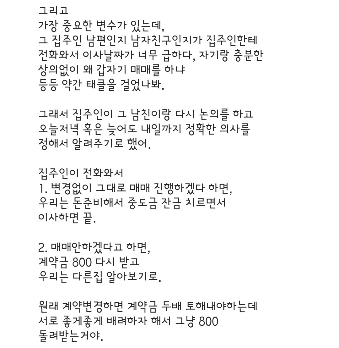 부동산 사장님의 설명은 이랬다. 일단 계약금 800을 보내서 우리의 매수 의사를 정확히 하고, 집주인 측에서 오늘 저녁에 최종 상의를 한 뒤에 확실히 진행하겠다고 하면 원래대로 중도금 잔금 치러서 매수하시면 된다. 그렇지만 집주인이 안 판다고 하면 아쉽지만 계약금만 그대로 돌려받는 걸로 하자는 거였다.