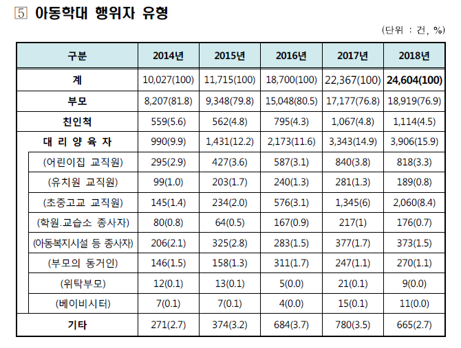 2018년 전체 아동 인원은 약 817.6만 명, 그중, 어린이집에 다니는 아동은 141.5만 명입니다. 그러면 가정에서 양육하는 아동은 676.1만 명이 되겠네요. 그럼 학대 발생 비율을 계산해보면