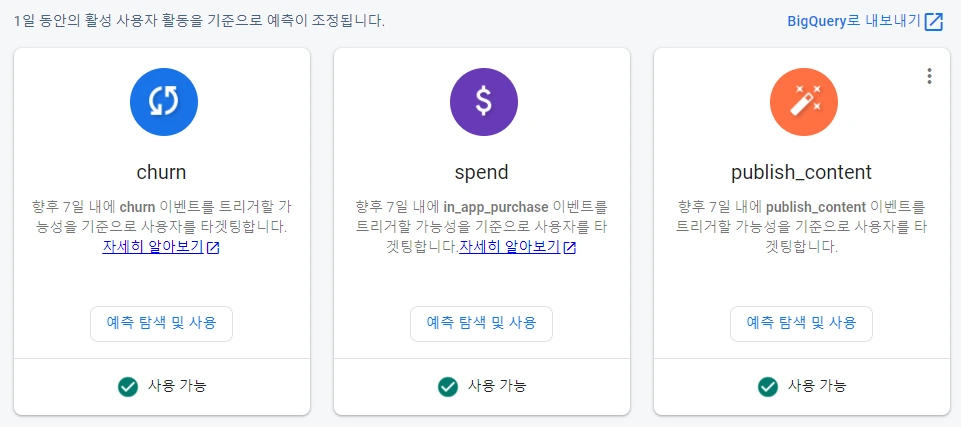 프리딕션(Prediction)으로 이탈 가능성이 높은 사용자를 타겟팅한 뒤 → 인앱 메시지(In App Messaging)로 쿠폰 푸시 발송 같은 응용기(?)도 가능하니 한번 활용해보면 좋을 것 같습니다.