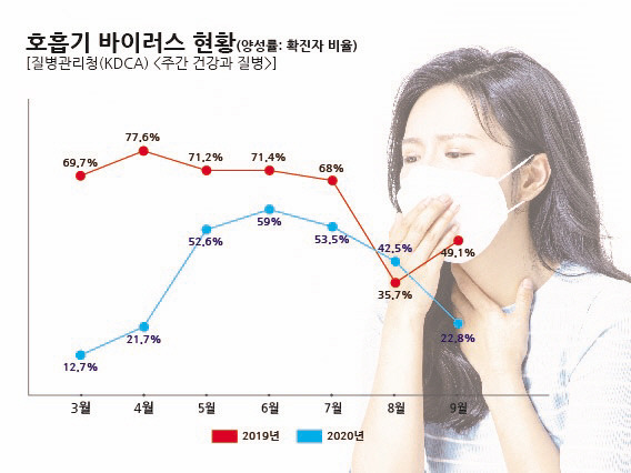 질병청이 전국 17개 시도 보건환경연구원 및 52개 의료기관을 표본보고기관으로 한 `호흡기 바이러스 현황`에 따르면 코로나19 대유행이 시작된 지난 3월부터 9월까지 호흡기 바이러스 양성률은 △3월 12.7% △4월 21.7% △5월 52.6% △6월 59% △7월 53.5% △8월 42.5% △9월 22.8%로 지난해 같은 기간과 비교했을 때 8월을 제외하면 많이 감소했다.