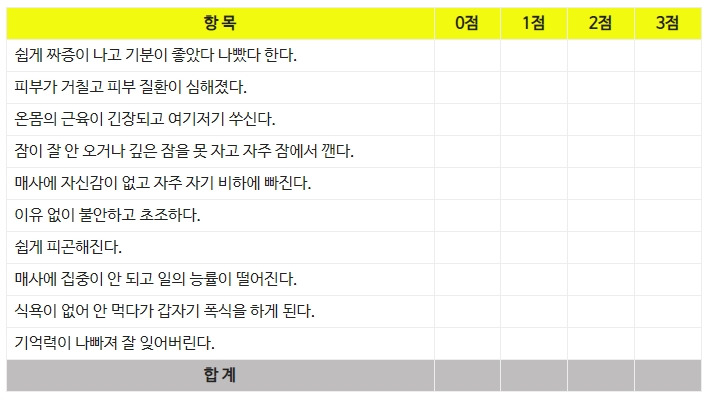 그렇다면 스트레스를 어떻게 측정해볼 수 있을까? 간단하게 측정할 수 있는 자가 진단은 다음과 같다(이 외에도 다양한 자가 진단법이 있다).