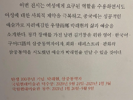 최근 국립현대미술관 청주관에서 전시 중인 <탄생 100주년 기념 : 박래현, 삼중 통역자(~2021.05.09)>를 보러 일부러 청주를 다녀왔다. 운보 김기창 선생님의 아내이자 그 자신으로도 20세기의 대표적인 여성 미술가였던 박래현 선생님의 탄생 100주년을 기념하는 전시였다. 작품에 대한 호기심도 있었지만 그녀의 삶에서 여자로서의 삶의 힌트를 얻을 수 있지 않을까 하는 마음도 있었다.