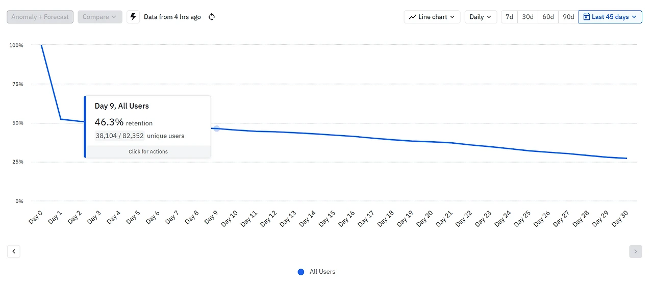 리텐션(Retention Rate)은 일정 기간 동안 서비스를 계속 사용하는 사용자 비율, 즉 유지율을 의미합니다. 이탈률의 반대 개념으로 볼 수 있는데요, 예를 들어 앞선 사례에서 1월에 1000명 중 800명이 남았다면 리텐션율은 80%가 됩니다. 보통 N일차 리텐션이나 N월차 리텐션처럼, 기준 시점 이후 특정 시점까지 살아남은 사용자 비율을 살펴보는 방식으로 많이 활용합니다. 예를 들어 “Day 1 리텐션 30%”는 신규 설치 사용자 중 다음 날에도 앱을 사용하는 비율이 30%임을 뜻합니다. 일반적으로 Day 1, Day 7, Day 30 리텐션율 등을 주요 지표로 삼아 신규 유저의 초기 정착 여부를 평가합니다.