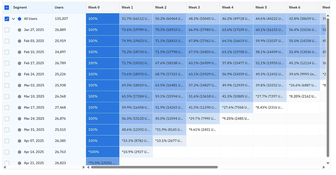 코호트(cohort)는 “특정 시기나 특성을 공유하는 사용자 집단”을 의미합니다. 예를 들어 2025년 4월에 가입한 사용자 그룹이나 광고 캠페인 A를 통해 유입된 사용자 그룹을 각각 하나의 코호트로 볼 수 있습니다. 코호트 분석은 이러한 그룹 단위로 시간 경과에 따른 행동 변화를 추적하는 방법입니다. 주로 가입 후 N일차 유지율이나 코호트별 매출 등을 비교하여, 사용자 유지 및 이탈 패턴이나 집단 간 행동 차이를 파악합니다. 예를 들어 1월 가입자 코호트의 1주차 리텐션이 50%인데 2월 가입 코호트는 40%라면, 2월에 유입된 사용자들의 유입 경로나 초기 경험에 문제가 있었다고 추론할 수 있습니다.