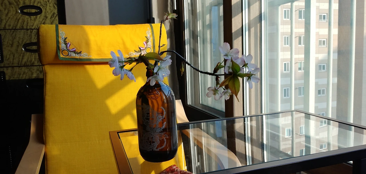꺾인 가지를 들고 와 빈병에 꽂아두고