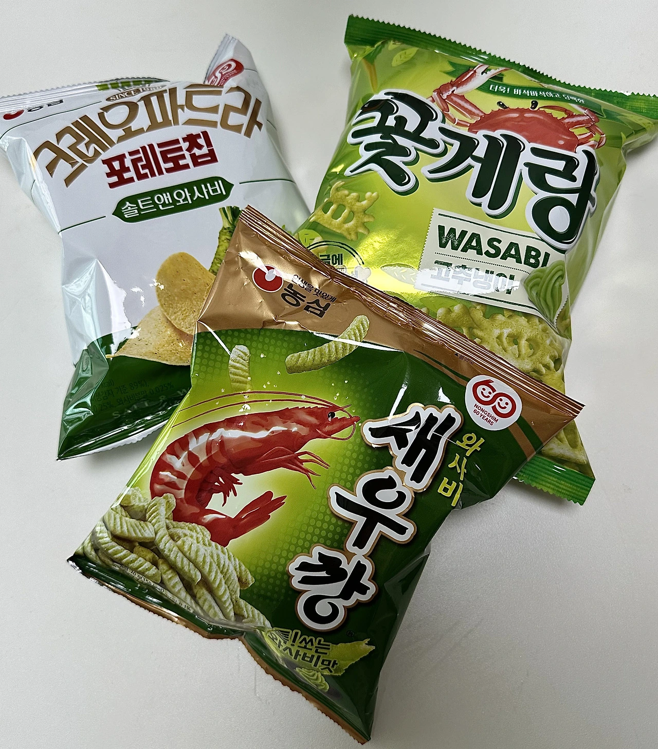 농심에서 60주년을 맞이해 와사비 맛 과자들을 출시했습니다. 개인적으로 두 개다 톡 쏘는 와사비 맛이 강해서 맛있지만, 크레오파트라 포테토칩이 더 조화롭고 맛있네요. 먹태깡 러버로서, 와사비 새우깡도 맛있게 먹었습니다. 얼른 친구들에게 나누고 싶어요. 동네 가게에 여유 재고가 있다면, 한 번 드셔보세요. :)