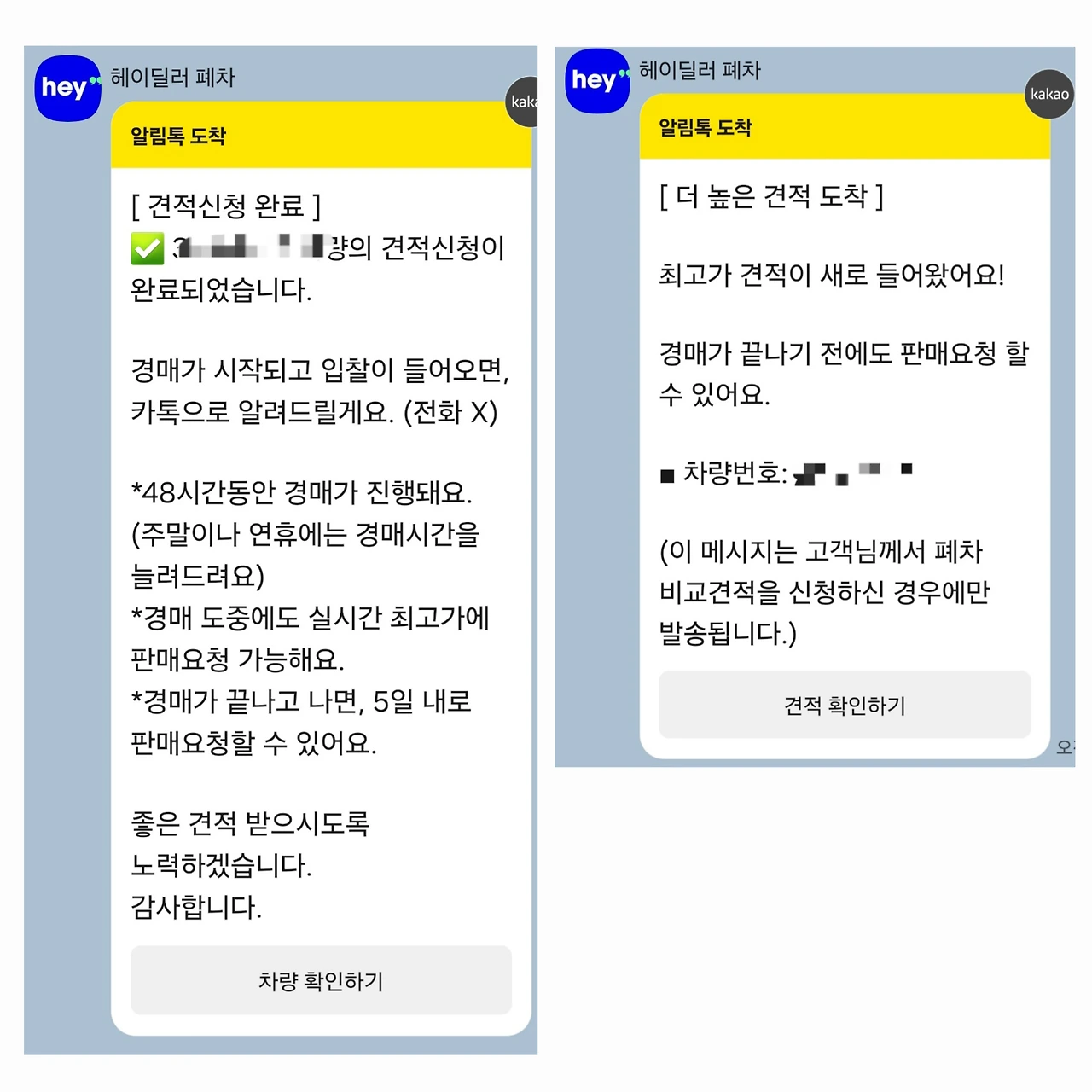 첫 번째 클릭. 폐차 전용 홈페이지로 들어가서 내 차량 번호와 거래 지역을 선택하고 카톡으로 견적을 신청했다.(클릭!) 신청하고 얼마 되지 않아 카톡으로 폐차 가격 입찰이 뜨기 시작했다. 내 차 번호를 입력했기에 내 차의 모델과 연식 등의 자료를 폐차장에서 확인할 수 있게 되어 있고 내차를 원하는 폐차장에서 가격을 제시하기 시작했다. 4시간 동안 총 9개의 폐차장에서 가격을 제시했다. 가장 높은 가격과 낮은 가격이 30만 원 이상 차이가 나기도 했다. 얼마나 많은 업체가 가격을 제시할지 몰라 이틀을 기다렸지만 더 이상의 가격 제시는 없었다.