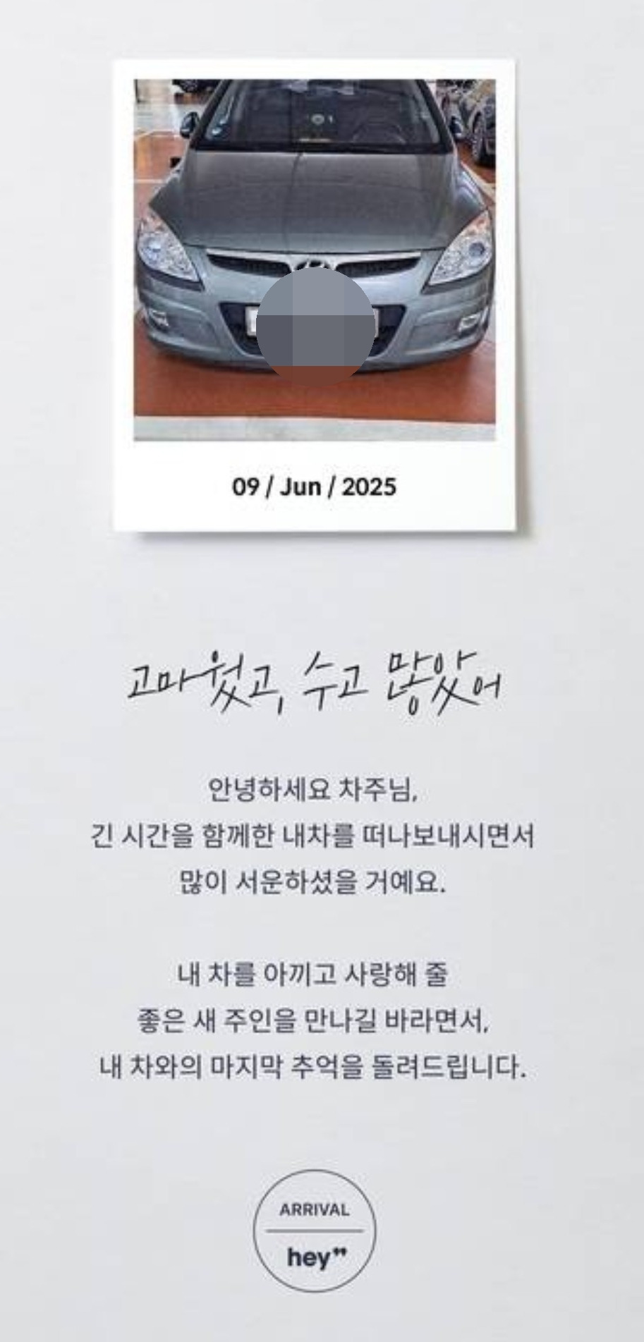 그 엽서를 읽으며 나도 모르게 코끝이 찡~ 했다. 폐차를 진행했던 헤X딜러에서 보낸 거였다.