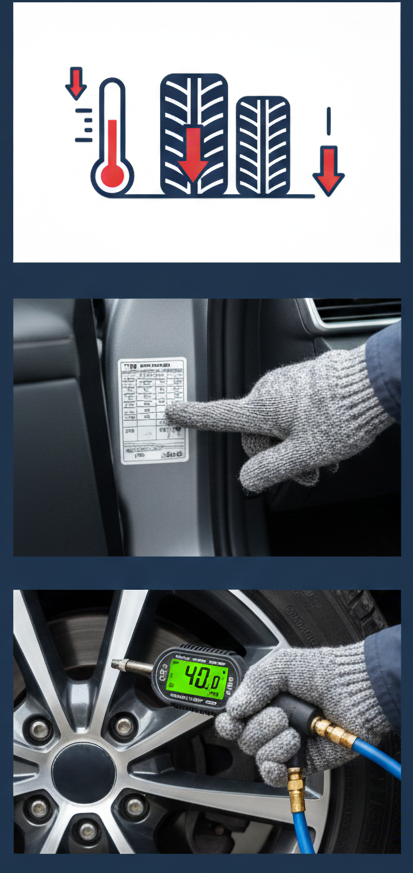 겨울철이 되면 외부 온도가 낮아지면서 타이어 내부 공기 부피가 줄어들어 공기압이 자연스럽게 낮아진다고 한다. 타이어 공기압이 낮아지면 지면과 닿는 면적이 늘어나는데 접지력이 불안정하여 주행 안정성이 크게 떨어지고 제동 거리가 증가하여 특히 눈길, 빙판길에서 위험하다고 한다. 또한 타이어 마모를 가속화시켜 수명이 단축되고 저항이 커져 연비저하로 이어진다고 한다.