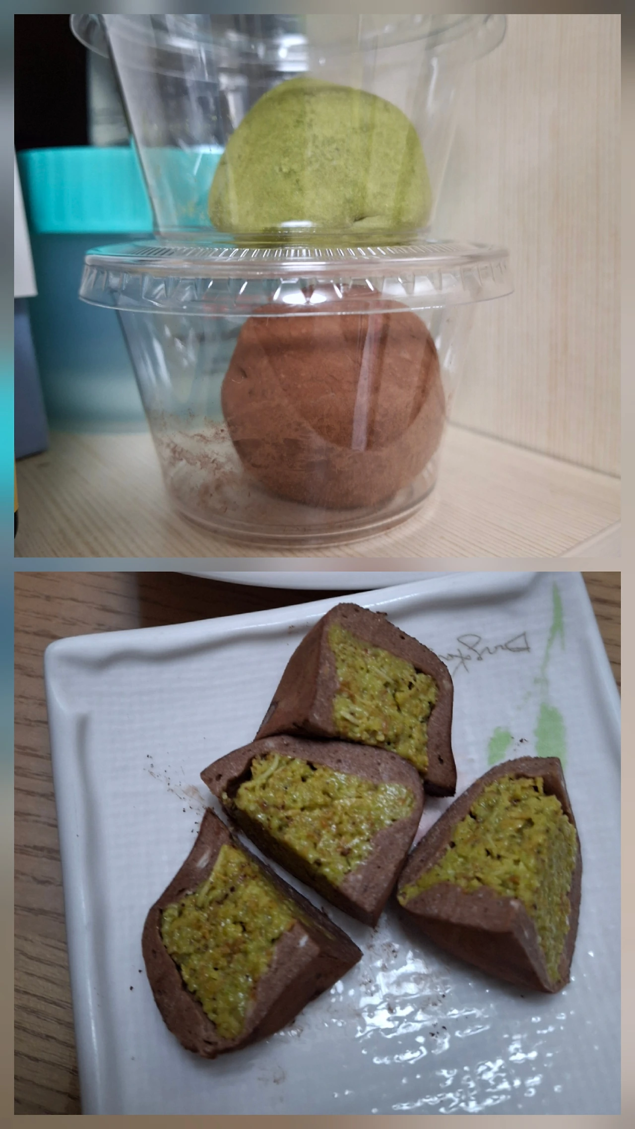 "집에 가져가서 식구들이랑 나눠먹으려고요. 2개 받았는데 하나는 초코, 하나는 말차예요. 금요일 밤에 같이 먹어요!"