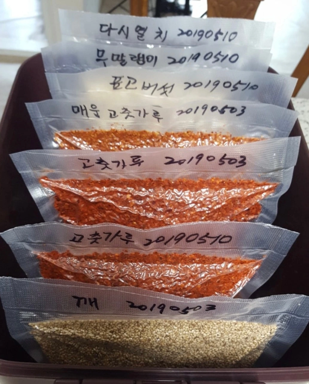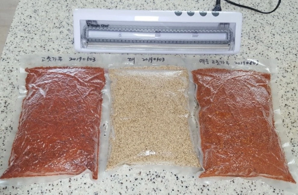 바짝 마른 식량들을 진공 포장기로 압축하고, 김장 때 준비해 얼려둔 김치 속 양념, 깻잎김치, 각종 반찬까지야무지게 챙겨 넣었다.