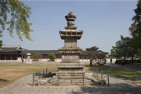 이 문화재가 여기에 온 사연은 간단치만은 않습니다. 일제강점기 때인 1915년 경복궁 자리에서는 시정오년기념 조선물산공진회(朝鮮物産共進會) (1915.9.11~10.30)가 개최되었습니다. 당시 강제 동원된 관람객은 총 116만 명에 달한다고 합니다. 당시 조선 인구가 1,600만 명 정도로 추산되어 인구 대비 7.2%에 해당했다고 하네요. 이때 전시 경복궁의 작은 건물들은 모두 철거되고 전시 명목으로 전국의 석탑, 고승의 탑비, 승탑 등이 차출되어 옮겨와서 전시물로 사용되었습니다. 일부 유물은 반출되기도 하고 운 좋게 남은 것은 용산박물관이 지어질 때 이전되어 후손들을 맞이합니다.