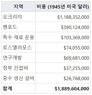 소요된 총비용은 약 20억 달러였는데, 2023년 기준으로 따지면 330억 달러로, 한화 40조 원에 해당하는 막대한 자금이다. 참고로 2021년 우리나라의 국방비 예산은 500억 달러 정도였다. 아래의 표는 1945년 12월 31일 자로 결산한 맨해튼 계획의 비용이다. 가장 큰 비용은 오크리치 기지를 운용하는데 소요된 비용으로 대략 63%의 예산이 사용되었다.