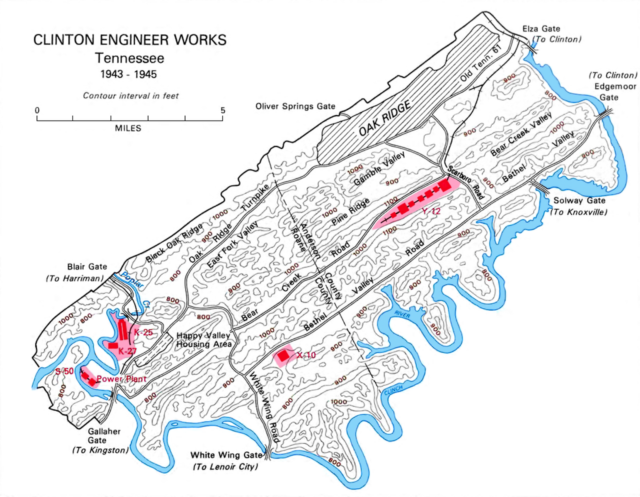 레슬리 그로브스 장군은 블랙 오크리지 능선을 따라 59,000 에이커의 땅을 지정해 약 30,000명의 공장 노동자들이 거주할 새로운 도시와 네 개의 주요 시설을 짓도록 했다.