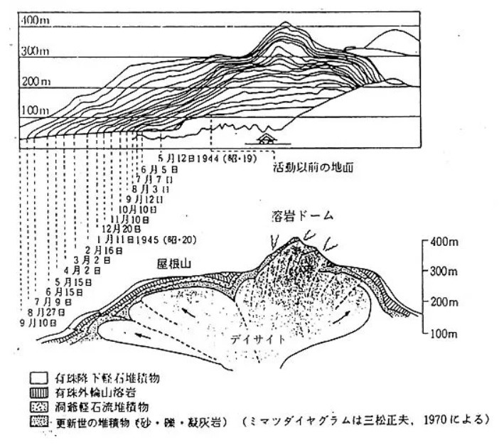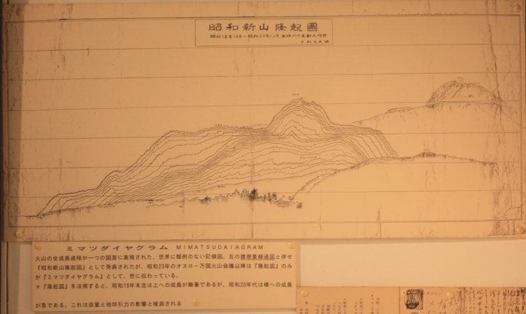 이 두 장의 다이어그램은 지리학자이자 지질학자(그 당시에는 서로 구분하지 않았던 듯하다)인 다나카다테 히데조(田中館秀三, 1884~1951)의 노력으로 1948년에 노르웨이 오슬로시에서 개최된 국제 화산 회의에 제출되었다. 회의 참가자들은 전쟁 중에 벽지에서 일어난 화산 탄생의 상세한 기록을 아마추어가 남겼다는 사실에 감탄했다. 그리고 미마츠 다이어그램은 화산학 역사에 찾아보기 힘든 업적이 되었다. 참고로 멕시코의 파리리쿠틴 화산(2771m)도 1943년 갑자기 평지에서 생겨난 화산으로 유명하다.