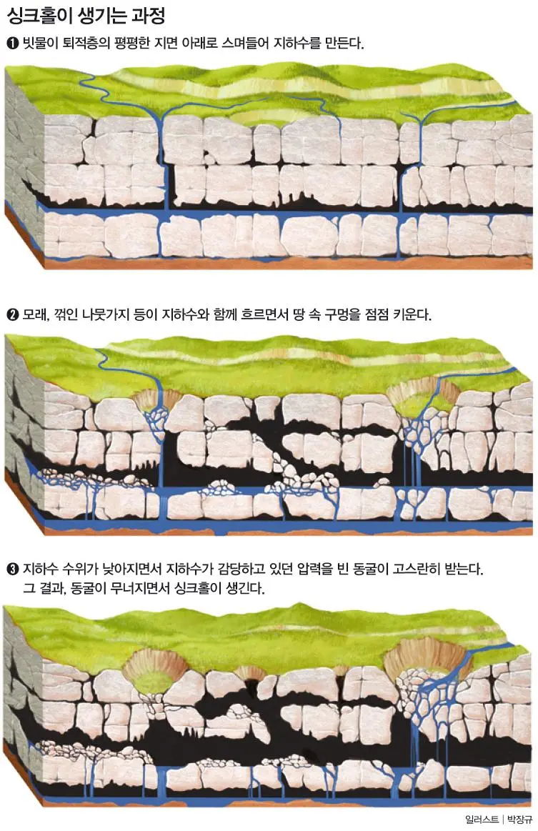 석회암지역의 경우, 대기 중의 이산화탄소가 빗물에 녹아들면 약한 탄산을 형성하는데, 오랜 기간 지하수로 흘러들게 되면 석회암이 녹아 흘러나가고 점차 빈 공간이 형성된다. 입구가 접근이 편리한 곳에 있다면 석회동굴로 유명해지겠지만, 지표면에서 흔적이 없다면 언젠가 무너질 싱크홀의 후보지가 될 수 있다. 우리가 잘 아는 석회암 지역의 돌리네 지형이 싱크홀의 흔적이다.