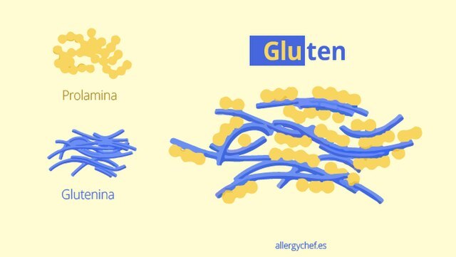 그림에서 프롤라민은 높은 프롤린(proline) 아미노산 함량을 갖는 식물 저장 단백질 그룹이다. 밀에서는 글리아닌, 보리에는 호르데인으로 불린다. 또 다른 단백질인 글루테닌은 밀가루 내 단백질로 전체 단백질의 47%를 차지한다. 즉 밀의 단백질은 글리아닌과 글루테닌의 두 가지로 구성되어 있다. 글리아닌은 빵의 점성, 신장성에 관여하고, 글레테닌은 탄성에 관여한다. 이 두 성분이 물과 결합하면 글루텐이 만들어진다.