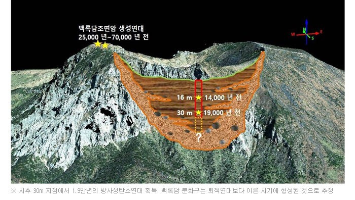 한편 조사진은 2016년 9월 백록담에 최장 36m의 구멍 6개를 뚫어 시추작업을 벌였다. 지하 30m 지점의 시료에서 1만 9000년의 방사성 탄소 연대를 획득했다고 밝혔다. 시추가 이뤄진 36m 지점 아래 퇴적층이 남아 있는 점을 감안할 때 백록담이 적어도 1만 9000년 전 이전, 즉 후기 구석기시대에 마지막으로 분출했을 것이라고 추론했다. 그 사이에 36m의 퇴적이 이루어졌다는 말인데 결국 그 원천이 주변 분화구 벽에서 왔을 테니 백록담의 높이는 지금보다 더 높았을 것으로 생각된다.