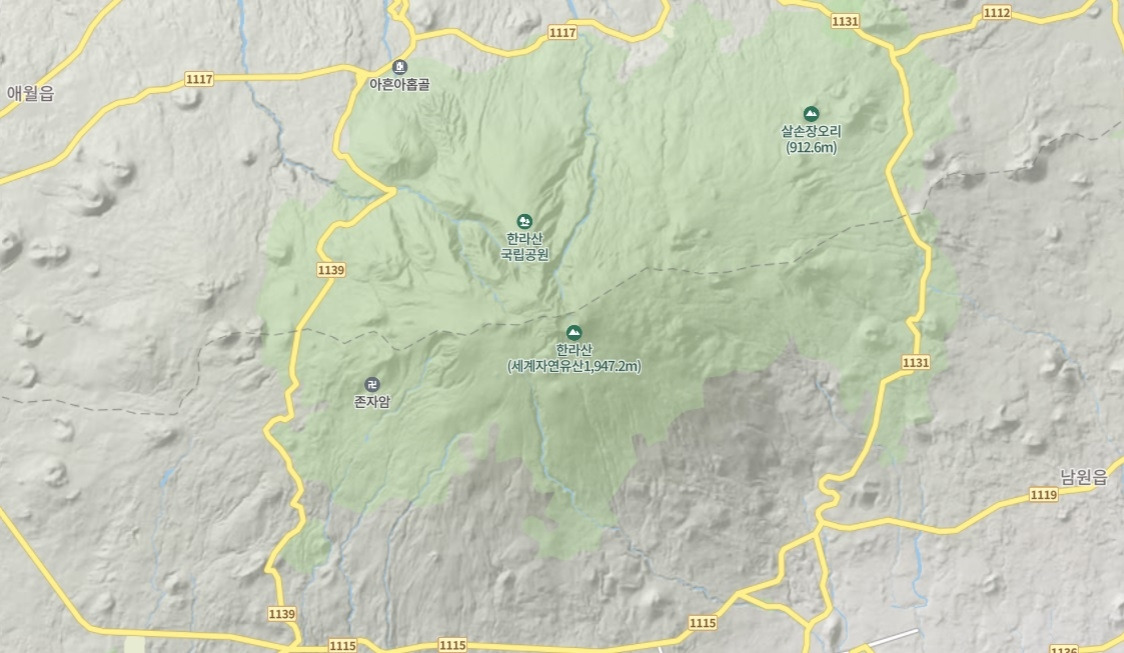 한라산의 높이 1947.2m(카카오맵에는 높이표시가 없다), 출처: 네이버 지도