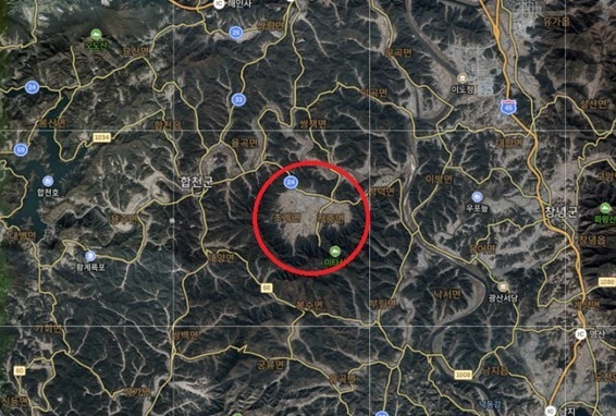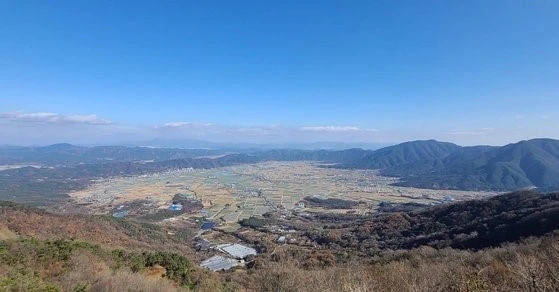 그림 3. 경남 합천의 운석 충돌구 지역(서쪽 대암산 방면에서 찍은 뷰). 사진 지질자원연구원