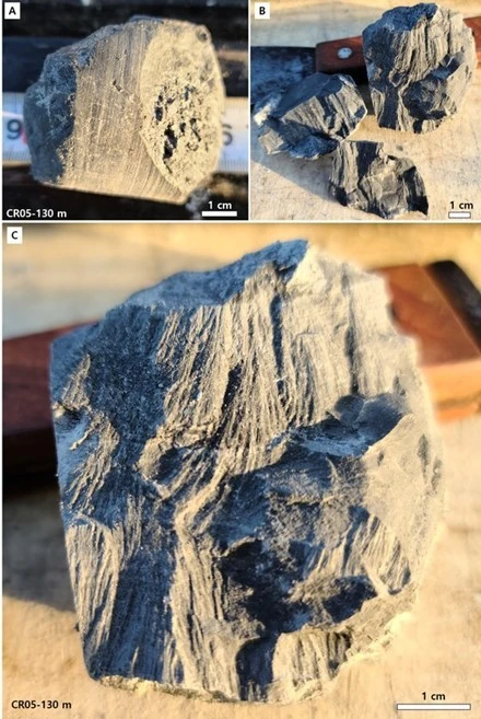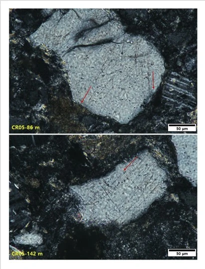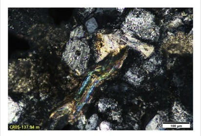 142m 충격각력암층에서 발견된 사암의 석영광물입자에서는 충격파로 만들어진 평면변형구조가 미시적 증거로 확인됐다. 또 130m에서는 셰일 암석에 충격파로 형성된 원뿔형 암석 구조(shatter cone)가 거시적 증거로 발견됐다(그림 8.).
