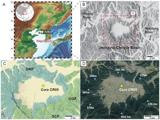 연구팀은 올 1월부터 분지 내에서 깊이 142m 시추 코어 조사(지도상에 Core CR05)와 탄소연대측정 결과를 통해 적중-초계분지가 운석 충돌에 의해 약 5만 년 전에 생성된 한반도 최초 운석충돌구임을 밝혀냈다(그림 4.).