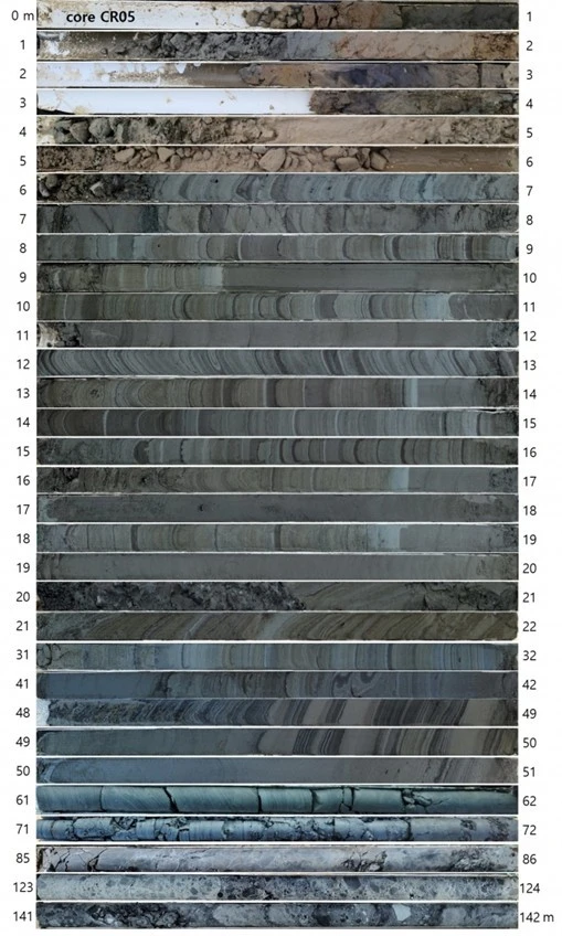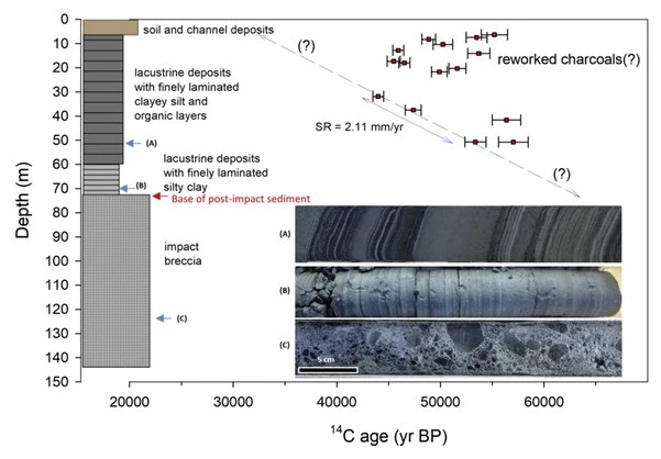 시추조사 결과, 분지 중앙의 142m 퇴적층은 크게 3개의 퇴적층서 단위로 구분됐다 ▶코어 상부(0~6.2m)에 있는 토양 및 하천퇴적층 ▶6.2~72m의 세립질 실트 점토의 엽층리를 포함하고 있는 호수퇴적층 ▶72~142m에서 발견된 충격각력암층(그림. 5)이다.